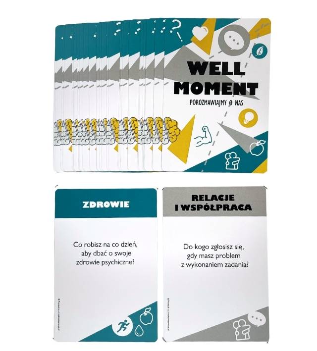 - Jeśli jesteś przełożonym warto wykorzystywać karty na cyklicznych spotkaniach – mogą być narzędziem do lepszego poznania się członków zespołu, ale też otworzyć dyskusję o zdrowiu, w tym zdrowiu psychicznym, współpracy czy celebrowaniu sukcesów.