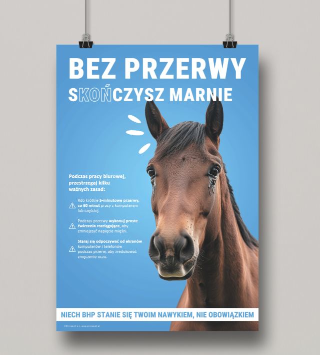 PLAKAT BHP ZRÓB SOBIE PRZERWĘ” to idealna przypominajka, że od pracy przy komputerze trzeba sobie robić cykliczne przerwy. Nasz konik doskonale wie, że praca bez wytchnienia prowadzi do problemów ze wzrokiem i układem mięśniowo-szkieletowym.
